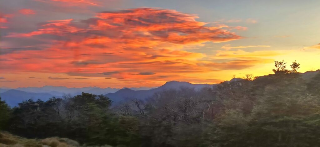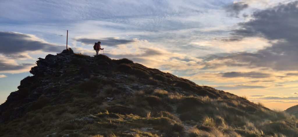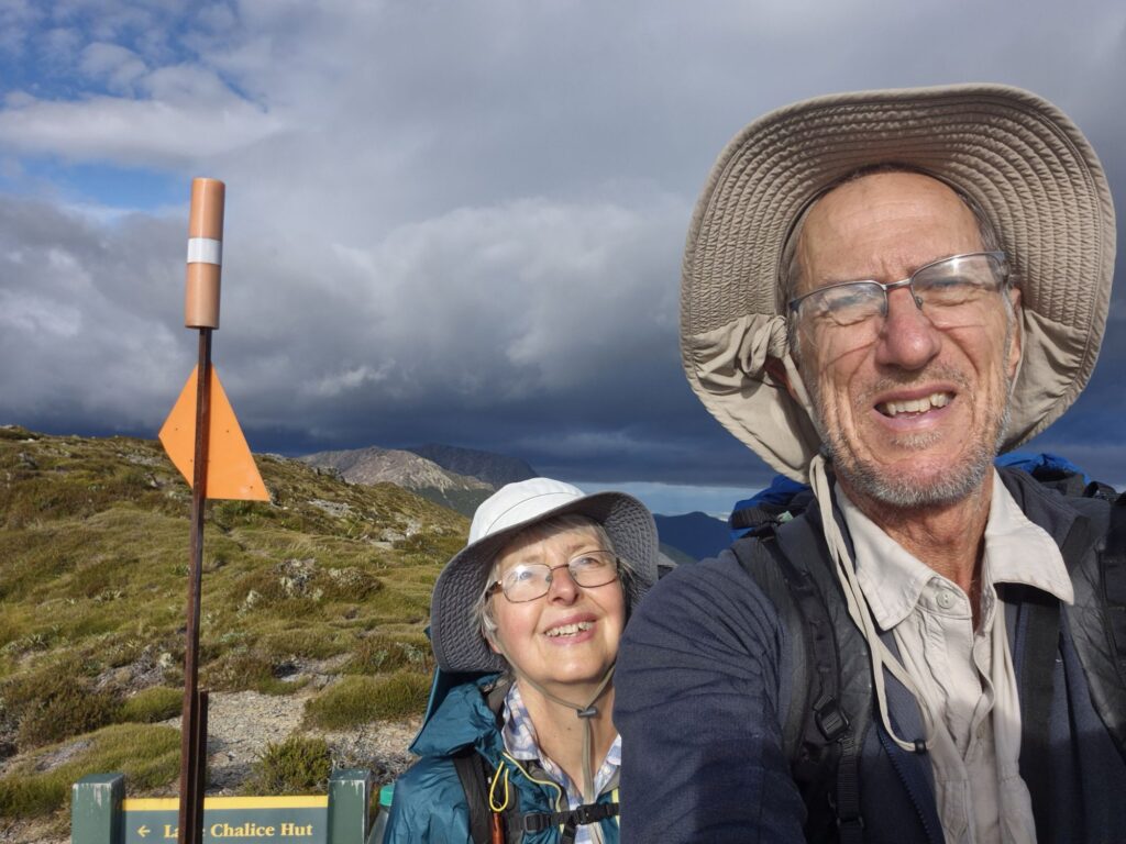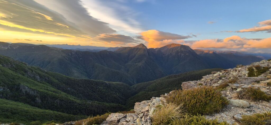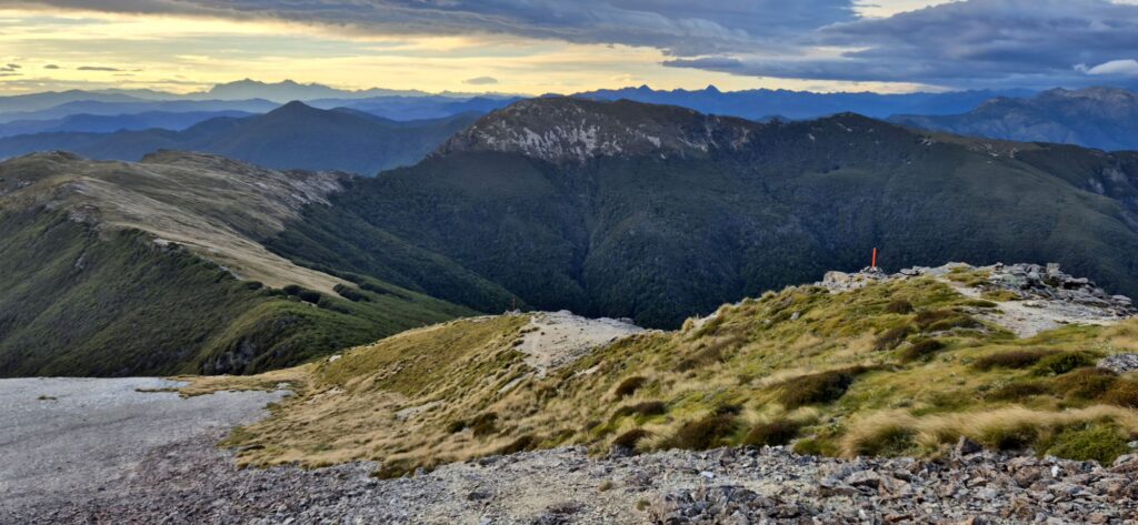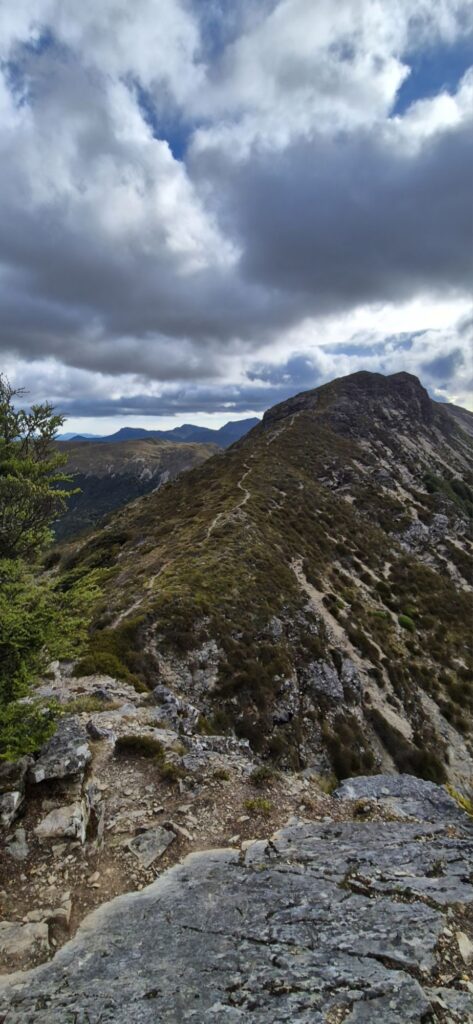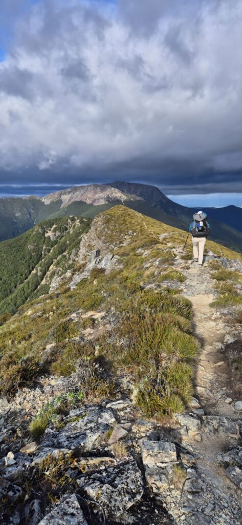 Above the treeline, we are walking on rocky ground with tussock grass and low shrubs. Again we were treated with views to the ocean and mountains on either side. It felt like we were on top of the world. Also, we had some phone reception which allowed Rob to check the weather forecast. Despite the forbidding skies, the cloud was not supposed to bring rain today.