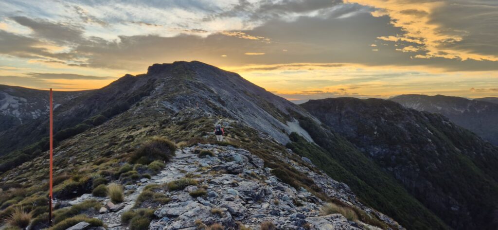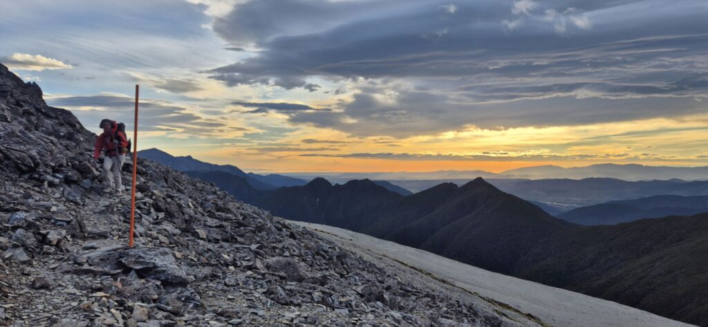 After a quick brekkie, we commenced the ascent on a steep scree slope, soon summiting our first peak of the day which brought us to a long stretch of ridge walking with breathtaking views to either side. This section was easy walking along a clear path.