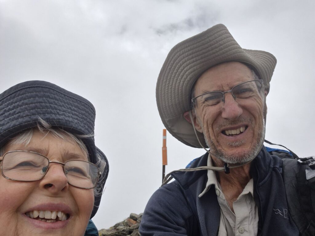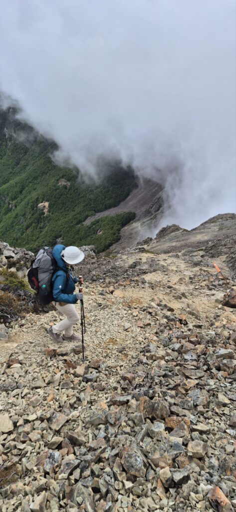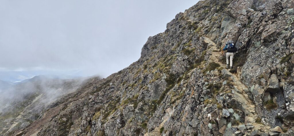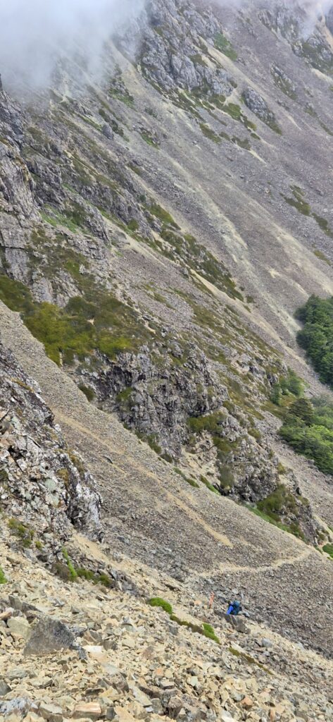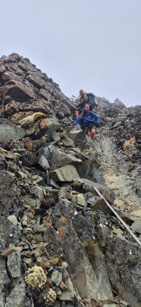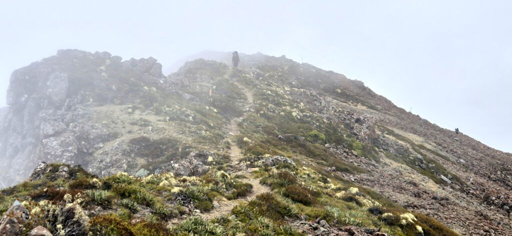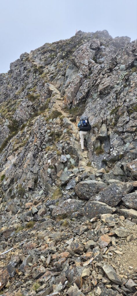 Then, as the cloud was coming over, we commenced the next very steep climb to summit Mt Rintoul. We could only just see the next trail marker as we reached the one before, and there was very light misty rain for a stretch. It would have been another stunning viewpoint but unfortunately we hiked this mountain in cloud. Strong wind gusts threatened to blow me off the top and continued until we were descending, again on a steep sliding shale surface.