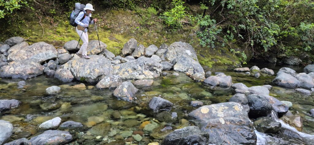 First we had a number of creek crossings which required rock hopping. Rob has much better balance and kindly gave me a helping hand midstream. I found the heavy pack’s weight quite destabilising but we made it across without mishap. Then the trail took us steeply up and the ascent continued in this way through the forest for a further 3 hours.