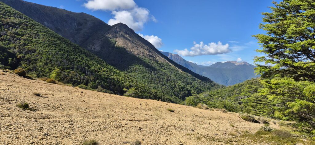 Then we had the inevitable steep descent followed by a stretch of easy forest walking before we again climbed through forest to reach another peak. Finally over the mountain top we saw Slaty Hut, our planned accommodation for tonight.