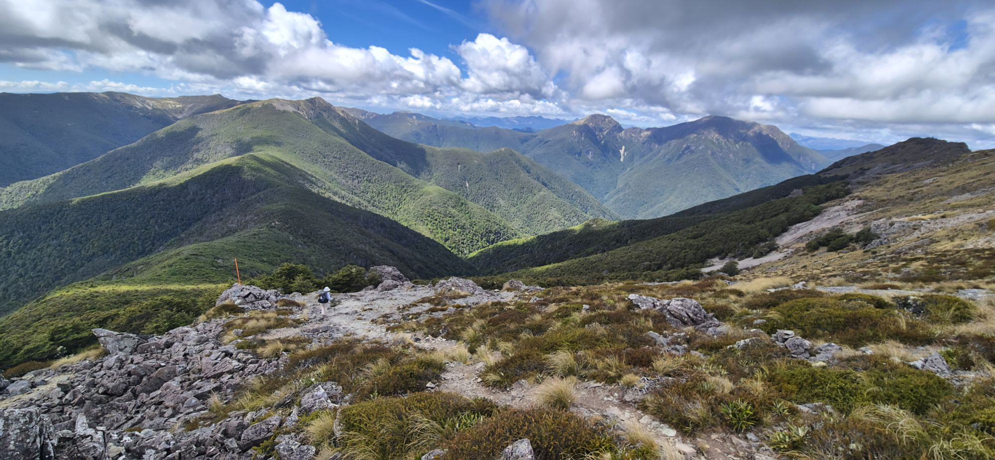 Then we had the inevitable steep descent followed by a stretch of easy forest walking before we again climbed through forest to reach another peak. Finally over the mountain top we saw Slaty Hut, our planned accommodation for tonight.