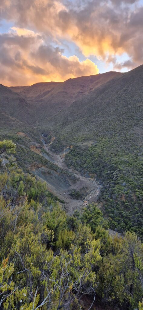 The expected rain came at around 10 pm and progressed to heavy rainfall through much of the night. Strong winds joined in the chorus, and i wondered how the 2 hikers that were in a tent were faring. I had gone out to them when the rain started and suggested they might prefer the hut but by then they were set up and confident that the tent would hold. With sore muscles it was hard to get comfortable and so was some hours before I finally fell asleep.