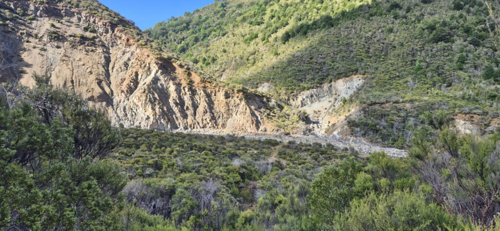 The dawn heralded a fine cool day and we set off for the last hut in this Richmond Ranges section – a 5 hour hike by DOC estimates. We were aware that there was a chance the river would be flowing too strongly for us to pass, given the heavy rainfall overnight so Stuart agreed to tackle the crossings together for safety. As it turned out, none of the crossings were a problem and we all managed to safely cross.