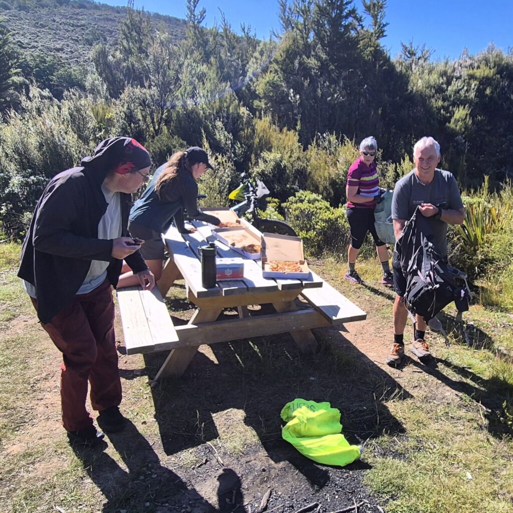 Then, when the campsite was full, 3 TA volunteers turned up on bicycles with pizzas, drinks, cherries and home baked bikkies. They also had a safety message and took feedback from us regarding the state of the trail. A great finish to the Richmond Range section.