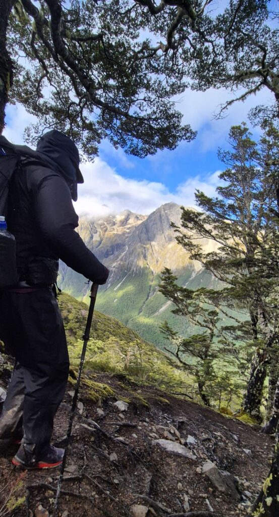 Then over the other side we had a slow, steep descent which started on the exposed rock and continued then through to forest, still at a very steep slippy angle. We had a few slips, but again no significant injury incurred.