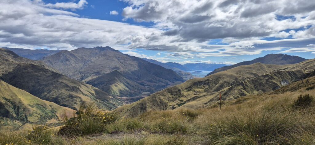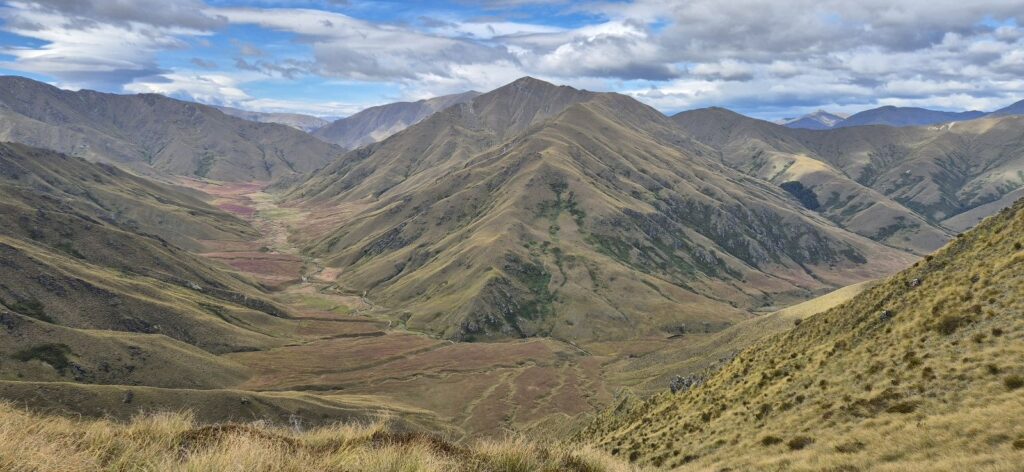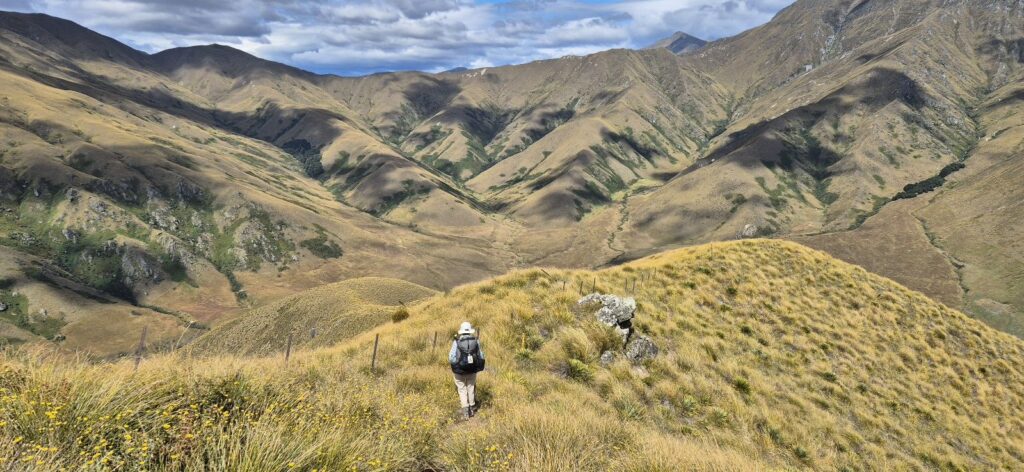 From the ridgetop we also had a view back to Lake Wanaka, and soon after we had our first view of Roses Hut ahead. The descent was not as difficult as anticipated, and then we crossed a creek where I stopped for a very pleasant wash, before we walked the last stretch through grassy meadows to Roses Hut.