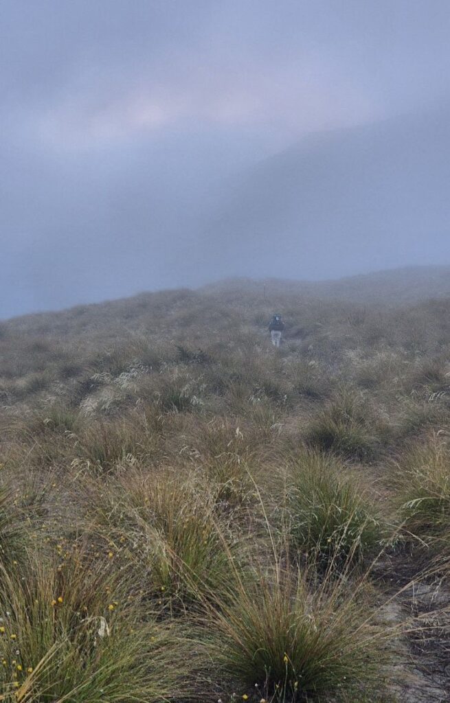 The clouds were still low and, as we ascended, the fog and mist added moisture to our upper bodies. With a cool breeze blowing we were soon quite cold and kept hoping the sun would break through the clouds to warm us. It was a long ascent again to Roses saddle at 1270m, 570 m higher than Roses Hut where we started.