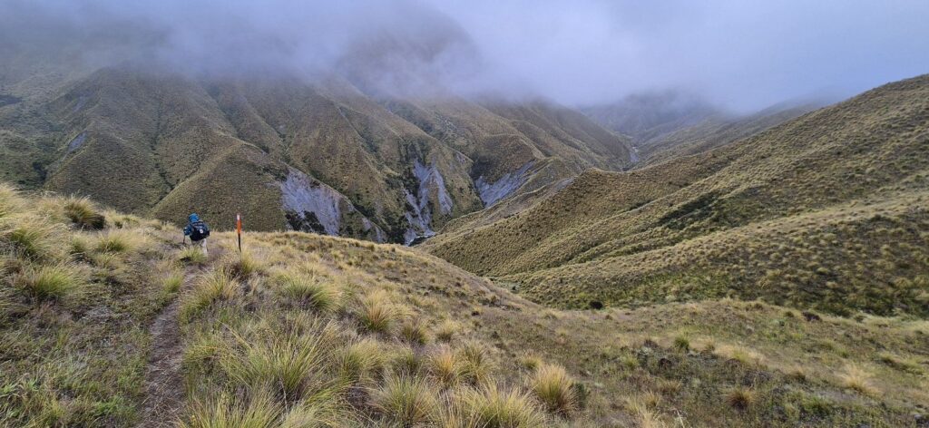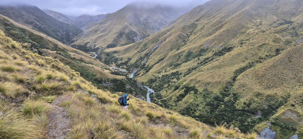 Unfortunately, with the low clouds, we missed the views that we know would have been amazing, both from the saddle and from the lovely ridge which followed. The downward track to the river was not too steep, and the path was wide and clear.