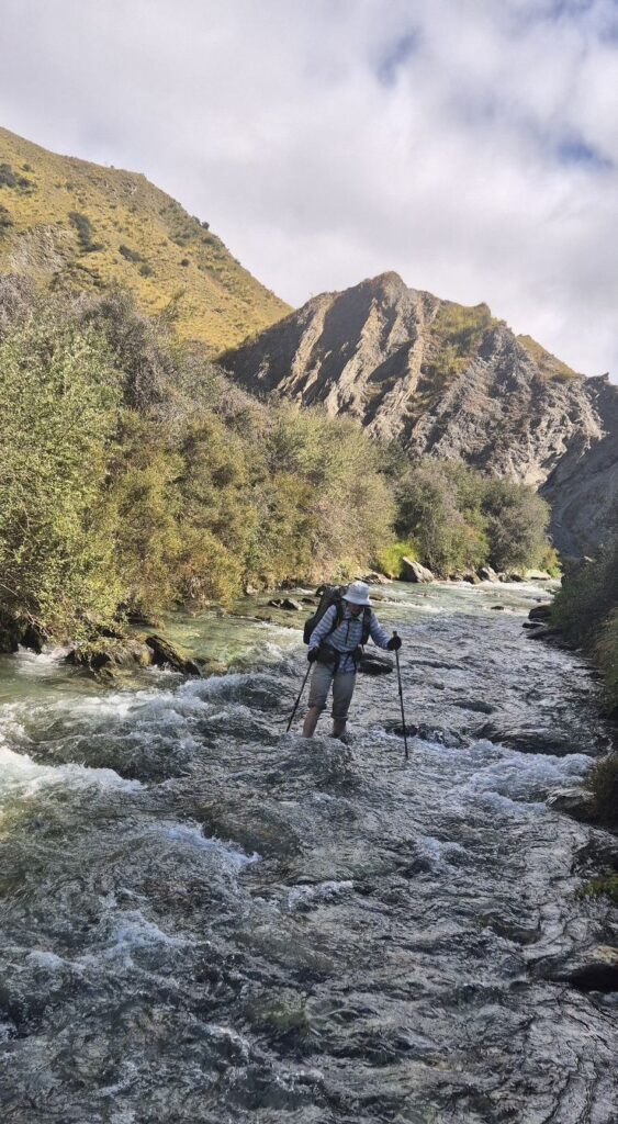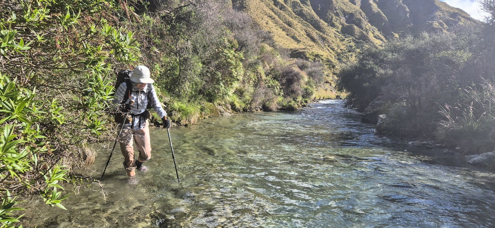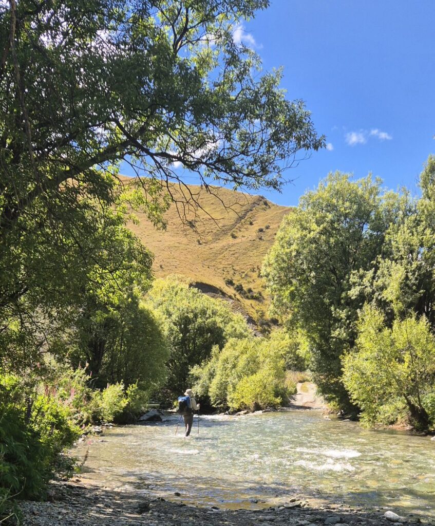 The next stage of today’s track was to make our way along Arrow River, both through the water, and, occasionally along the banks, for 4 km. Fortunately by now the sun was out and helped to warm us, but the river water was typically cold from the alpine streams.